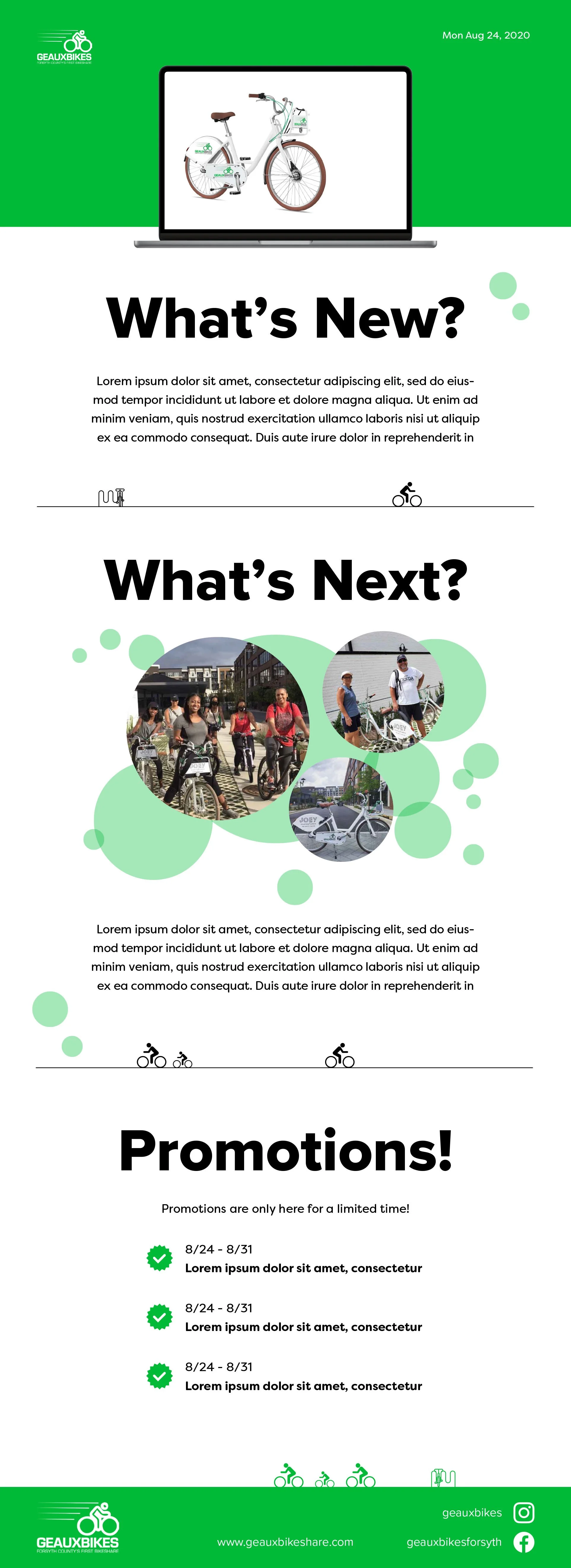 Carousel advertisements and newsletter template for Geaux Bikes, a pay-per-use and environmentally friendly bike-share company based locally in Forsyth County, GA.